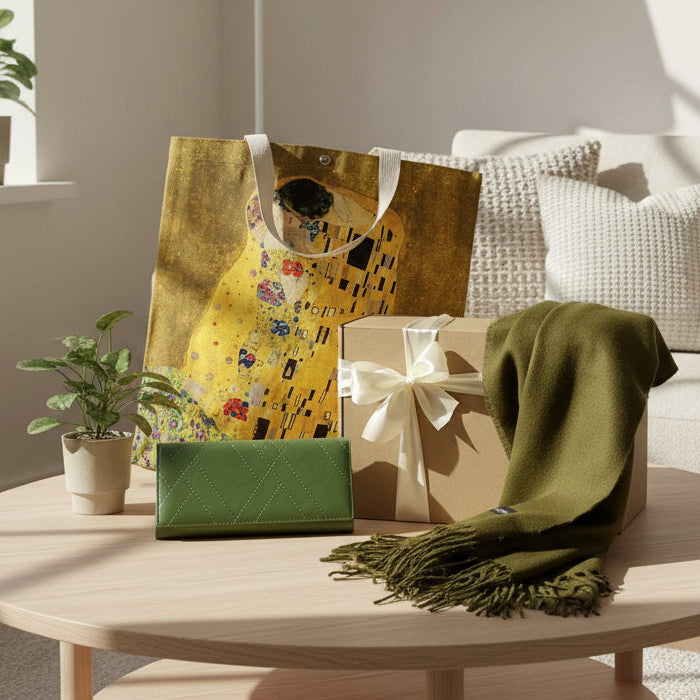 - Платнена чанта с дизайн на емблематичната картина „Целувката“ – носи артистичен чар комбиниран с практичност и красота